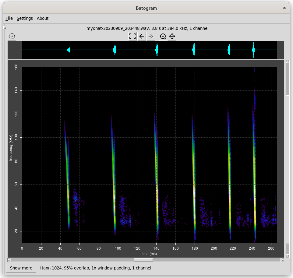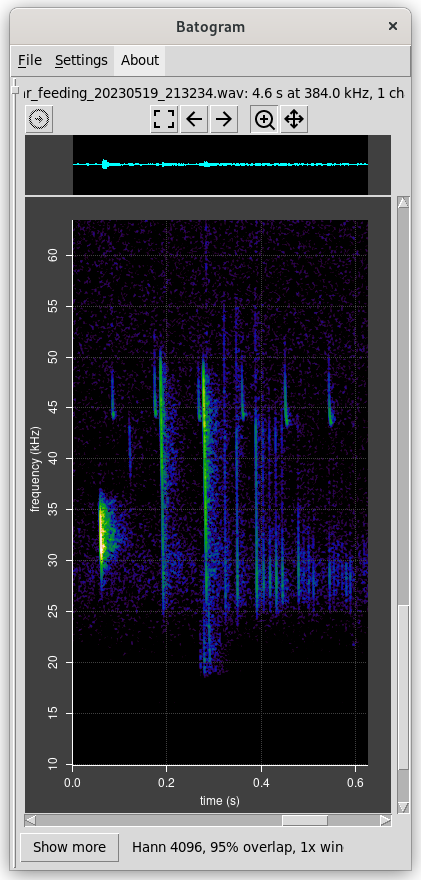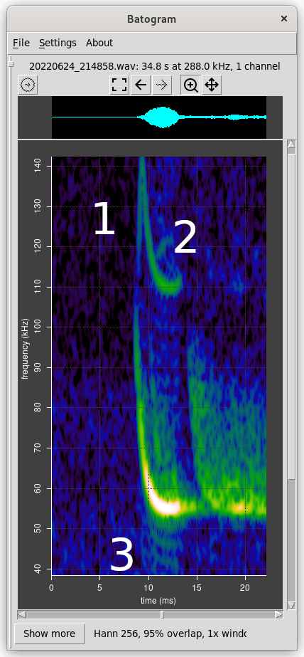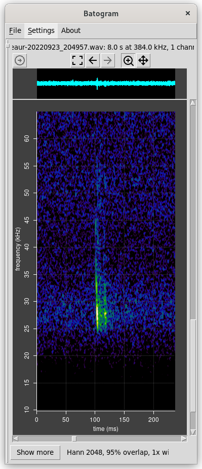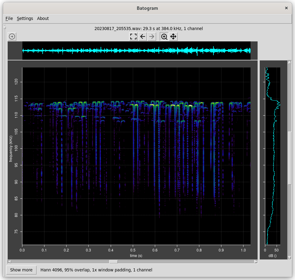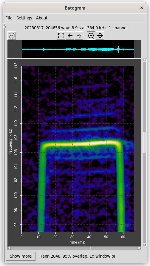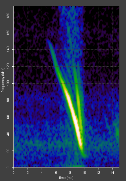 This rhinolophus hipposideros echolocation call shows faint side bands as parallel lines above and below the actual call. These are artefacts resulting from variable triggering latency and are eliminated in the most recent version by syncing the ADC kernel clock and the sampling rate.