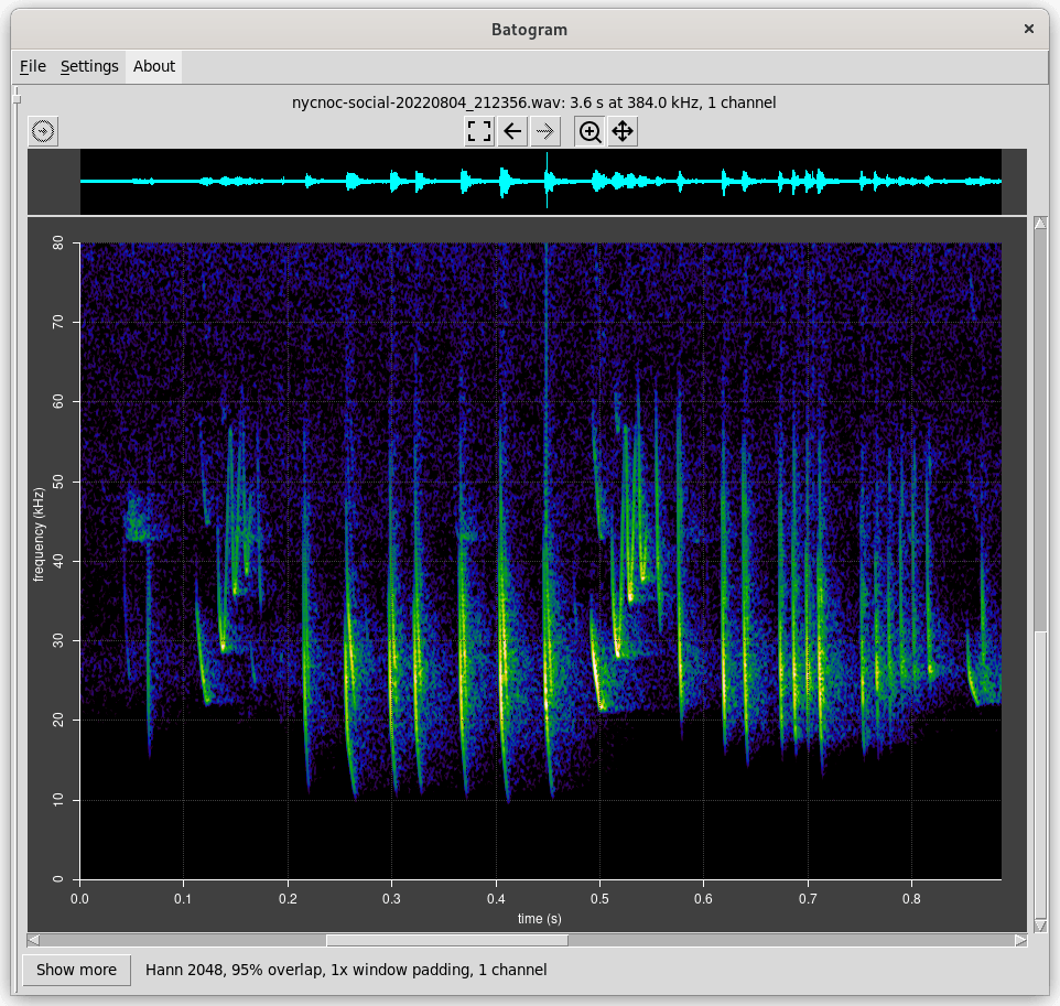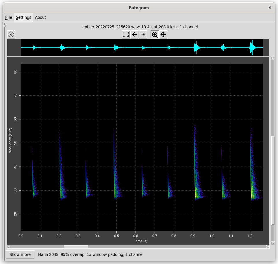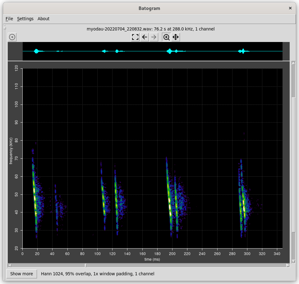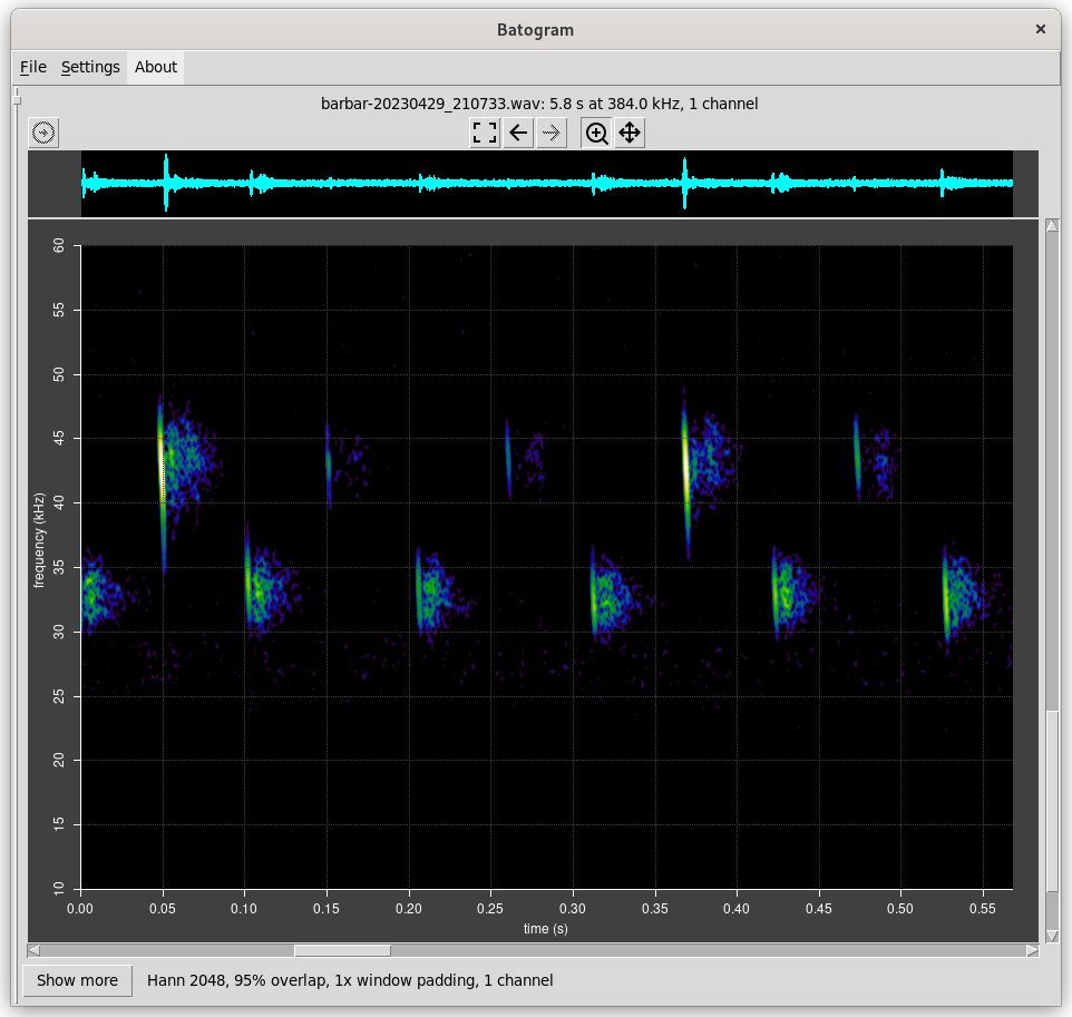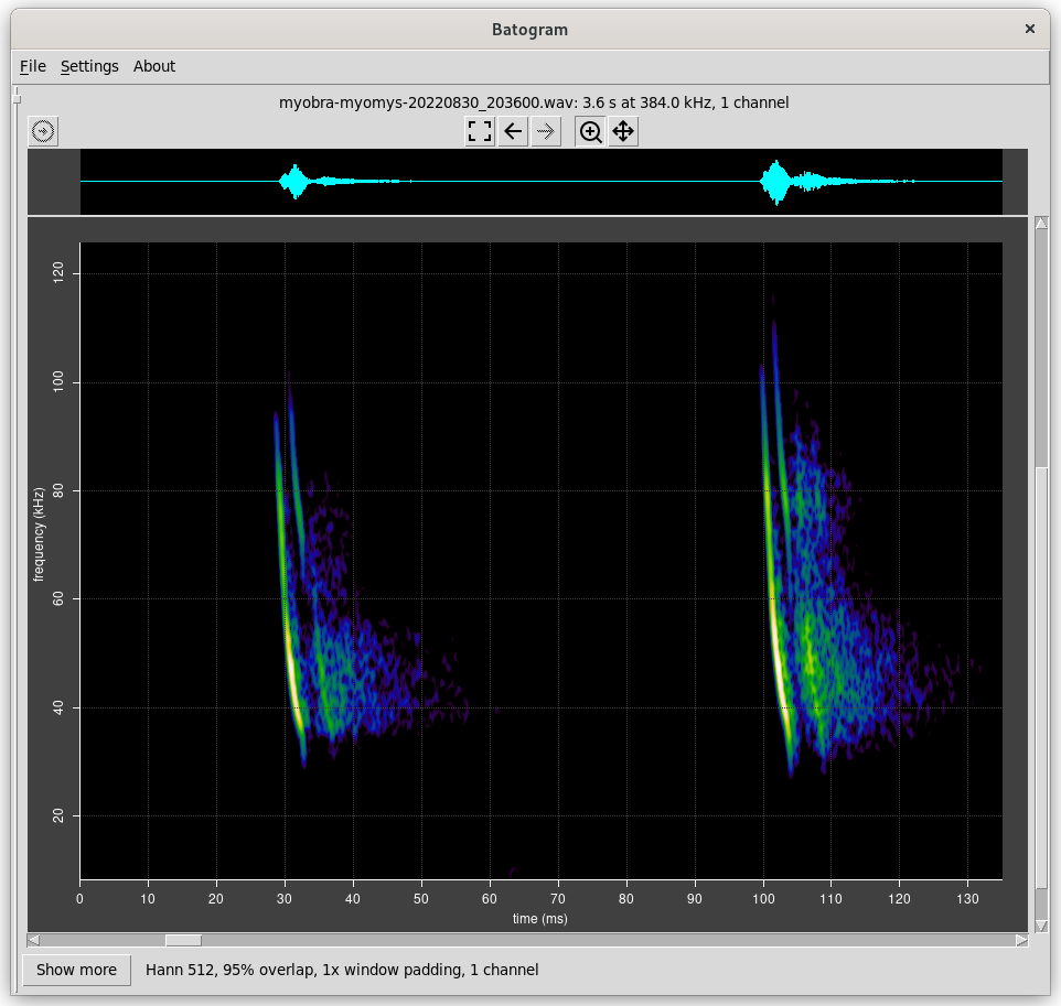 This rhinolophus hipposideros echolocation call shows faint side bands as parallel lines above and below the actual call. These are artefacts resulting from variable triggering latency and are eliminated in the most recent version by syncing the ADC kernel clock and the sampling rate.