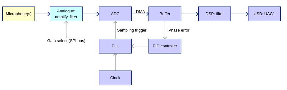 The source of raw data is the ADCs. These sample the microphone signals at a rate determined by their trigger, and the data is written into memory by direct memory access (DMA). The DMA controller generates interrupts when the DMA buffer is half full, and also when it is full. This allows the DMA interrupt handler to be copying one half of the DMA buffer to the circular buffer while the other half is being populated. Use of an intermediate circular buffer allows the ADC frame rate to deviate slightly from the USB frame rate, which inevitably it will.