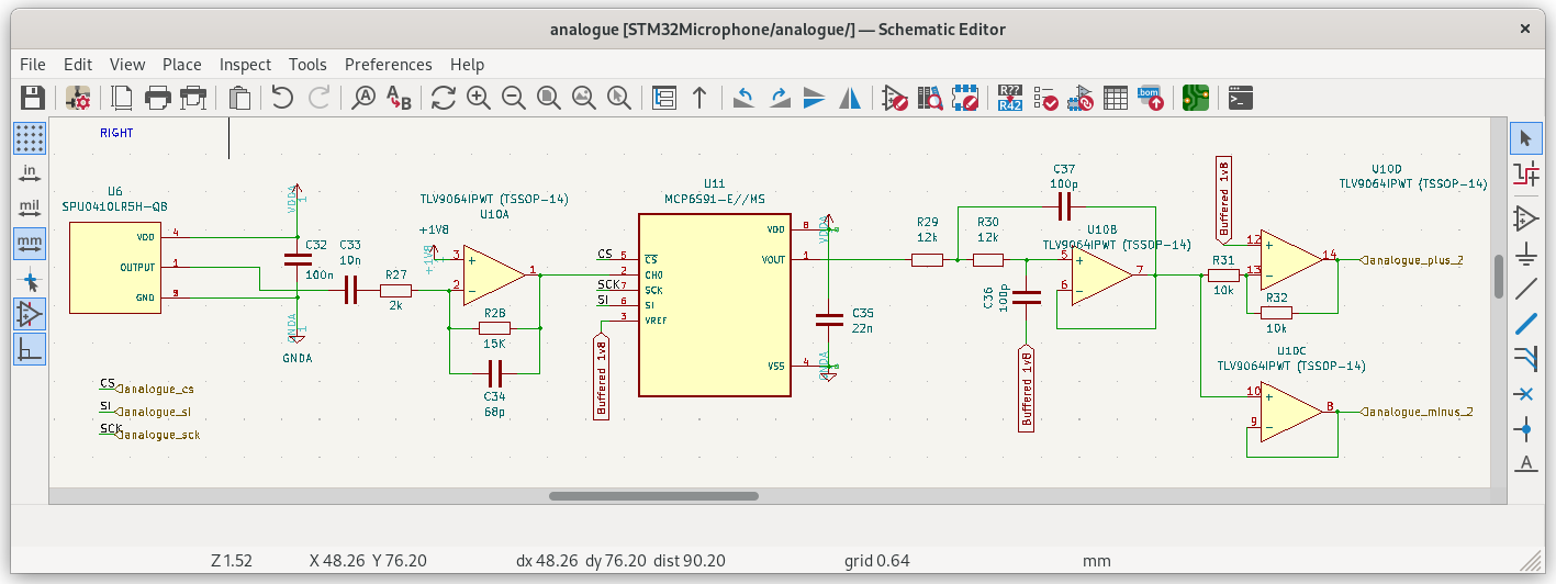 Analogue processing uses standard amplification and filtering stages. All analogue components are powered from a dedicated analogue 3.3V supply, and a 1.8V voltage reference is used for level shifting. The op amp chosen has a nominal gain-bandwidth product of 10 MHz, chosen to comfortably exceed the bandwidth required for bats. It describes itself as low noise. More on that later.