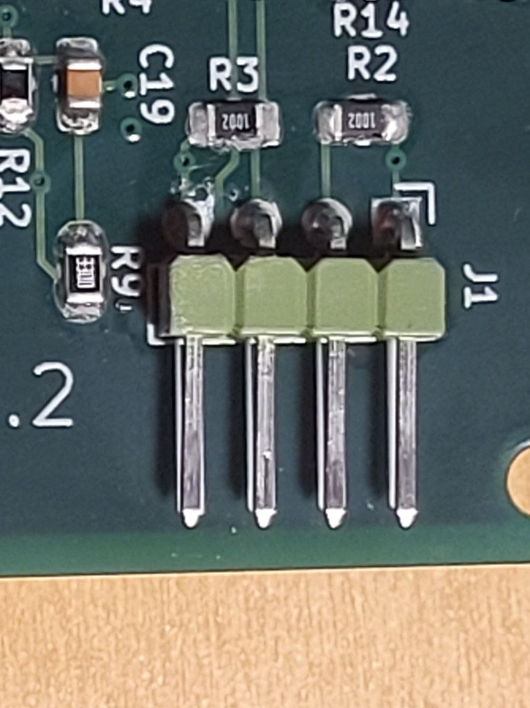 The MCU supports interactive debugging, and firmware update, via a Serial Wire Debug (SWD) interface. I chose the four pin version of this interface which was entirely sufficient. It is connected to a four pin PCB connector (J1) which need only be populated if interactive debugging is required. SWD is a high speed interface, so 22 ohm terminating resistors are included in the SWD clock and data lines to minimise ringing.