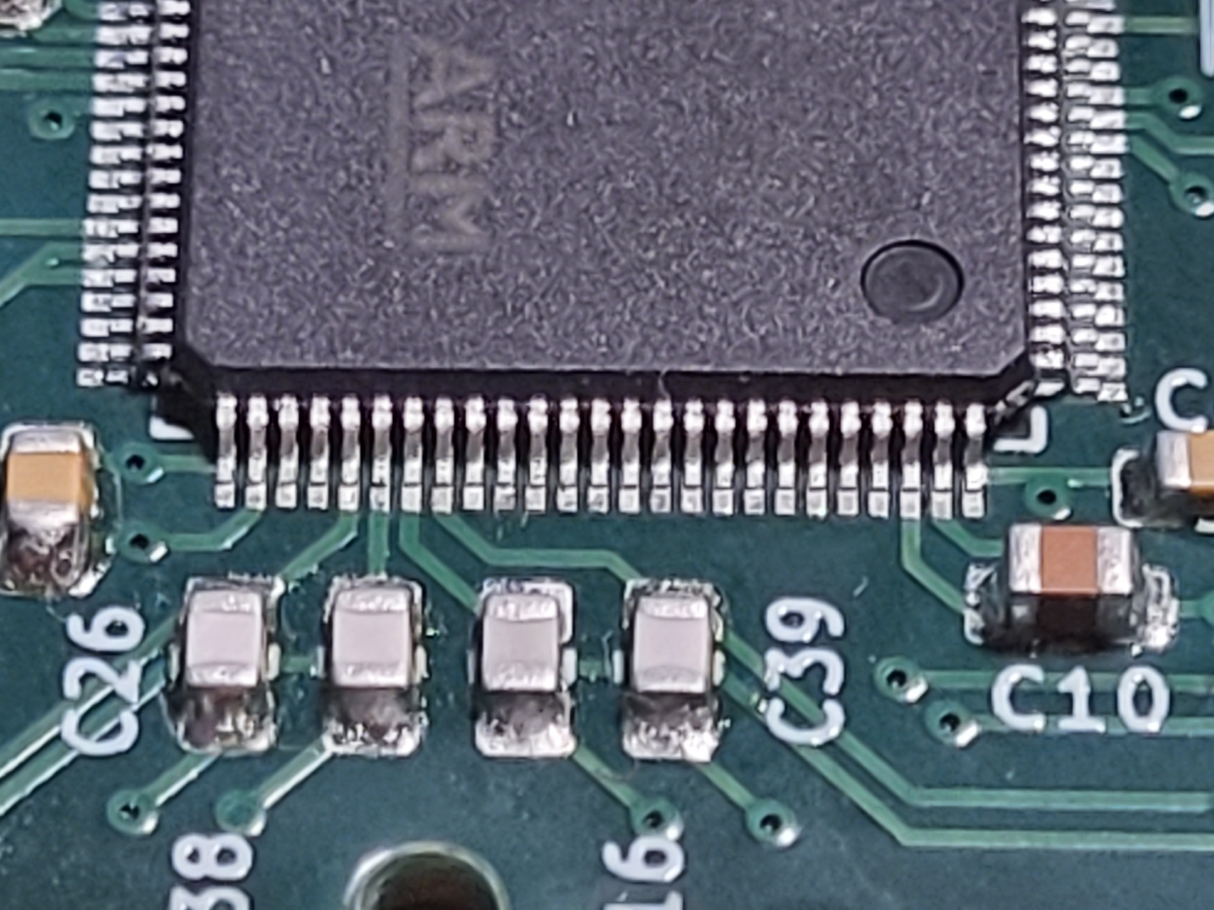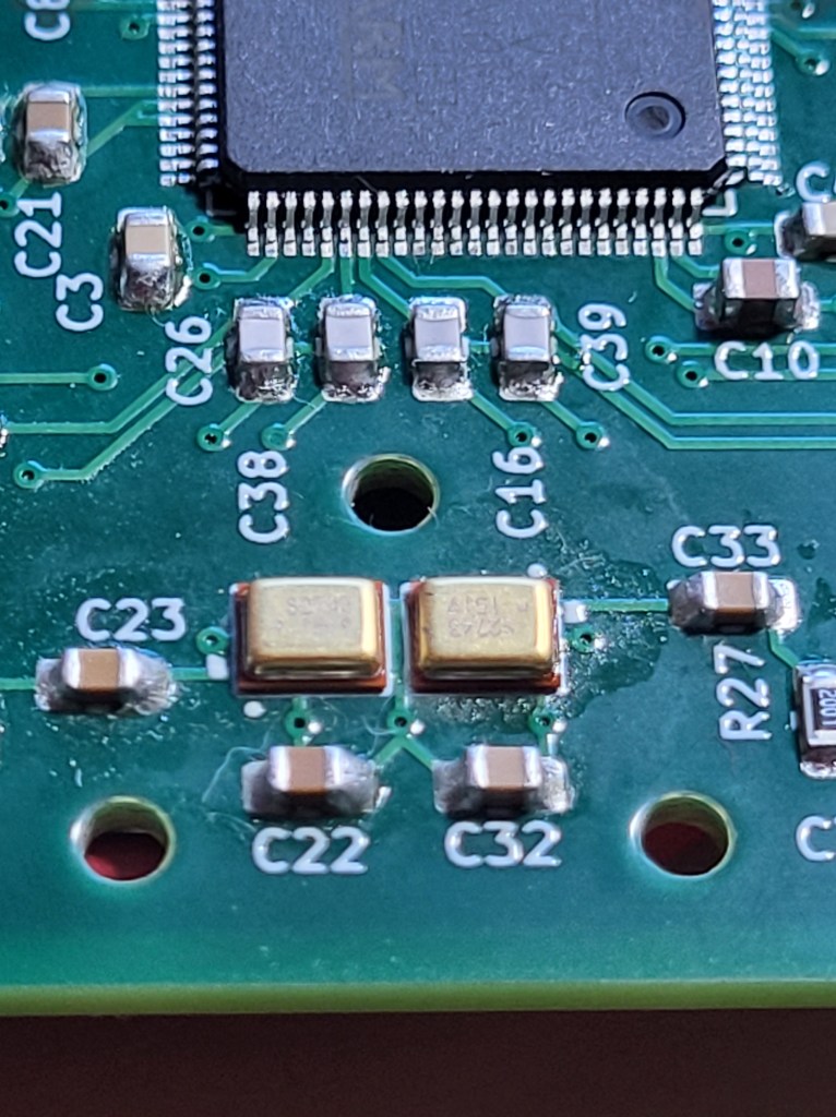 Zoom in with the camera on your phone to inspect soldering, particularly on the MCU pins. These are soldered with flux only and a hot iron with a small chisel bit – no additional solder. There is enough solder on the PCB to reflow into the pins. Passives such as these capacitors are conveniently placed on dabs of solder paste and soldered several at the same time with a hot air gun.