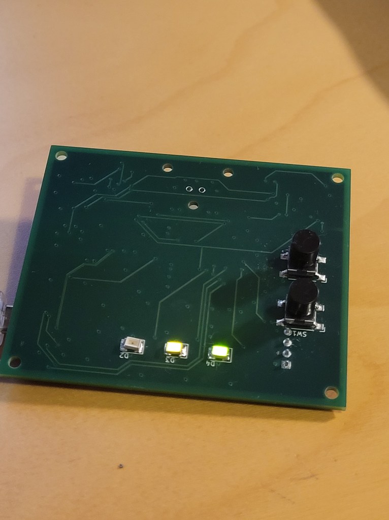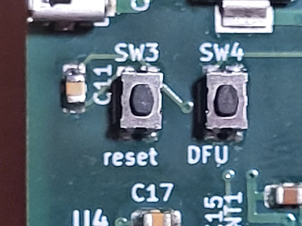 The MCU includes boot loader firmware which can be used to upload firmware to flash storage via various protocols, including USB Direct Firmware Update (DFU). This is convenient as free DFU clients are available for major computing platforms (linux, Windows, MacOS). Two micro switches are included in this design for this purpose, “reset” and “DFU”, connected respectively to NRST, and BOOT0 on the chip. DFU mode is entered by holding the DFU button down while clicking the reset button. At this point, the MCU present itself as DFU device: