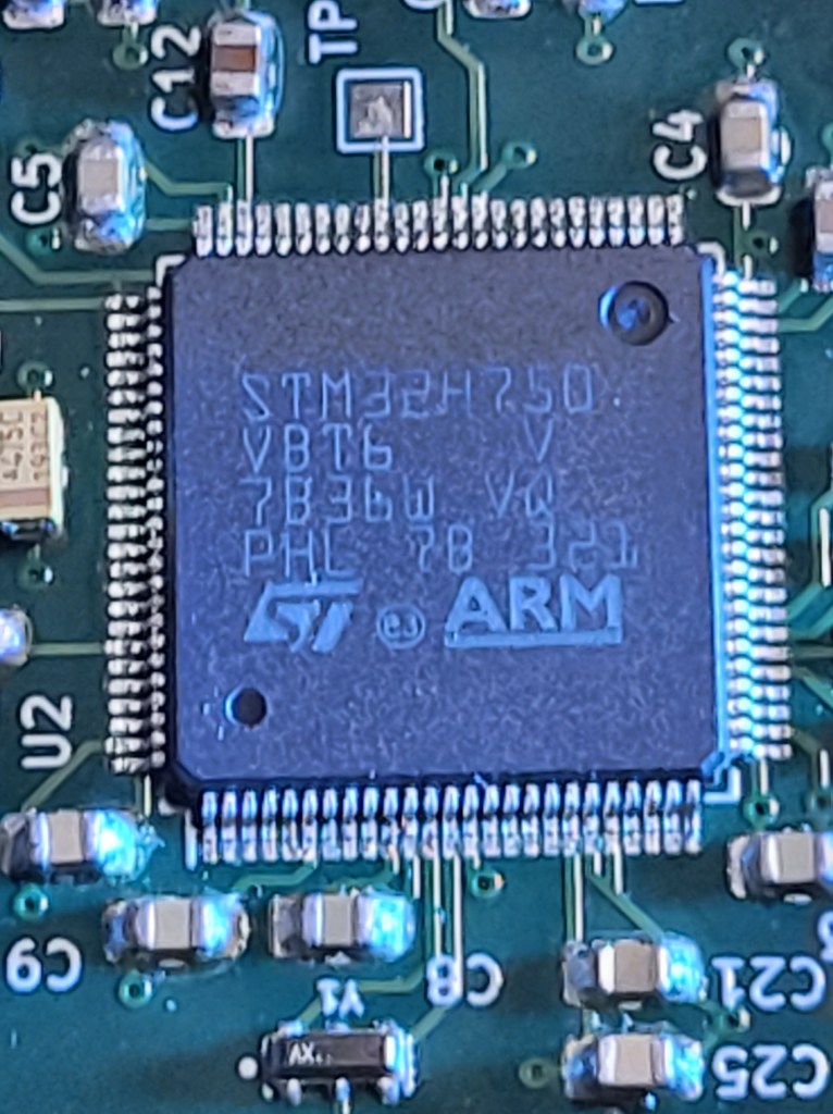 I settled on the STM32H7xx family of processors. These are very mainstream and mature with a strong ecosystem, both commercial and hobbyist. The STM32H750 is billed as the “value line” version of STM’s highest spec MCU, at the time time of writing, and costs around £12 in one off quantities.
