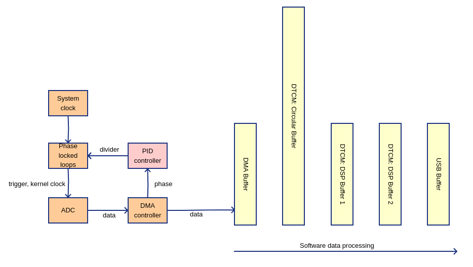 • The PID controller output drives the clock scaling ratio of a phase locked loop (PLL) within the MCU, varying the rate at which the ADC is triggered so that the DMA phase is maintained very close to its desired value.