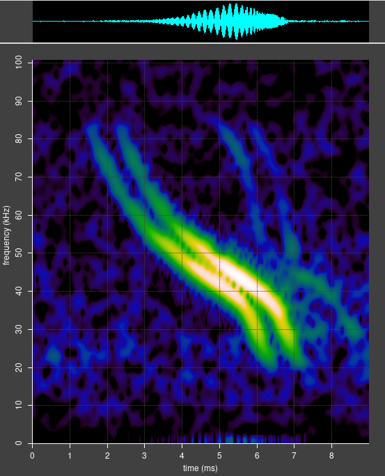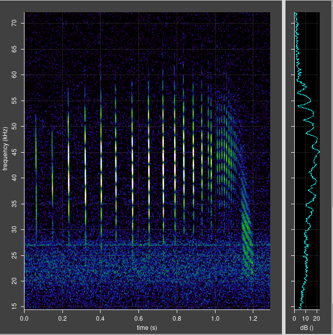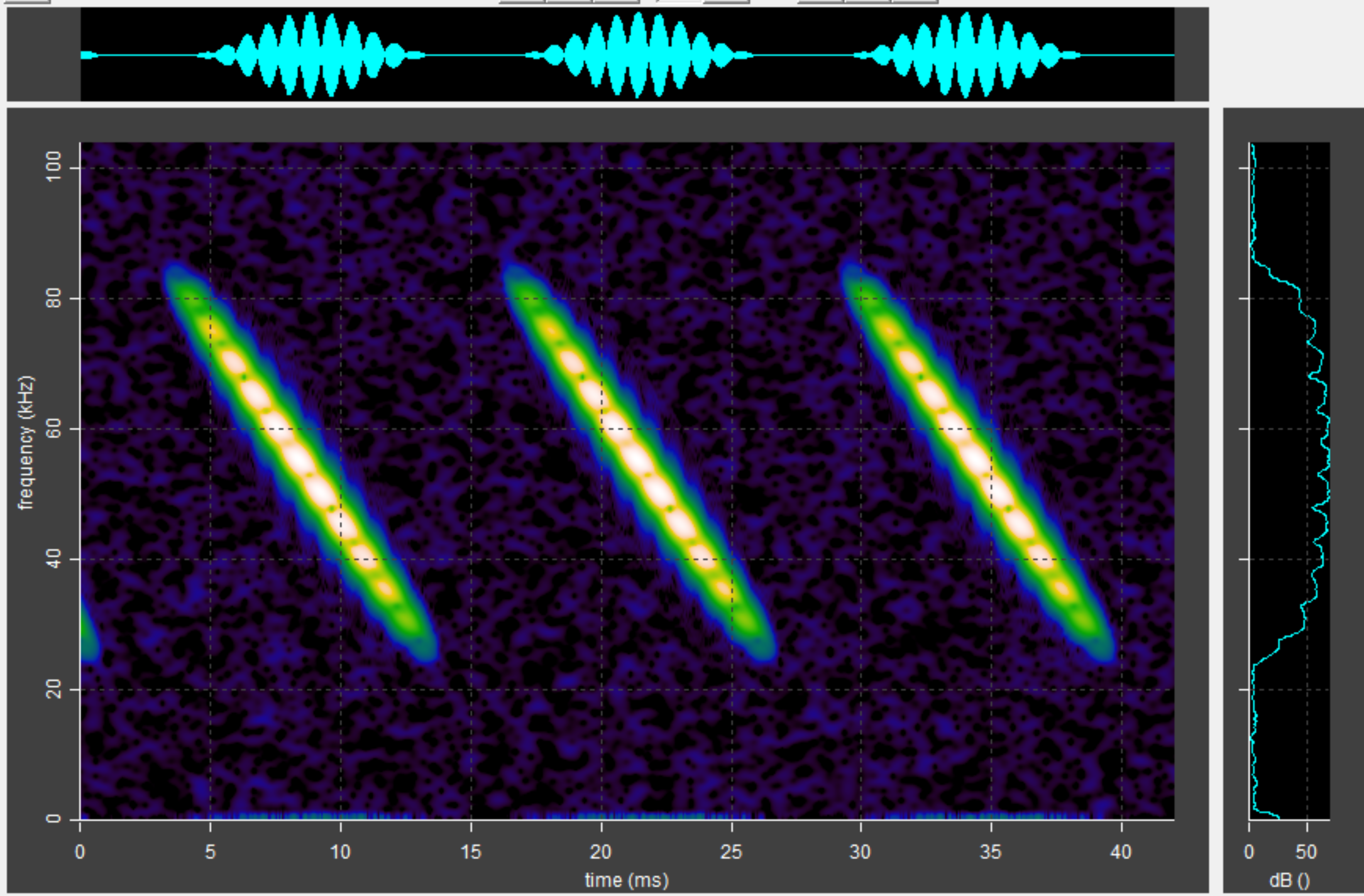 The other assumption we made is more problematic. We assumed the bat was emitting a constant frequency. But looking at a specific Daubenton’s bat chirp in the data used, there is a sweep from 83kHz down to 21 kHz in about 5ms – an average of around 12 kHz per ms. That means that the chirp arriving via the longer reflected path is about 6 kHz higher in frequency than the chirp arriving via the direct path. A correction would need to be made to the calculations above – though in practice, the effect seems to be small.