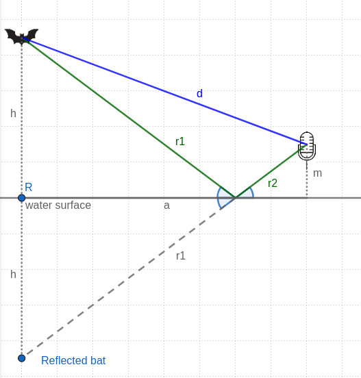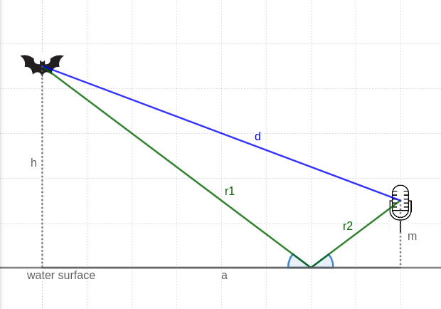 The diagram shows a bat flying at height h over a reflective surface, being detected by a microphone at height m, at a distance a. Sound waves arrive at the microphone via a direct path d, and by a reflected path (r1 + r2). We are interested in the difference in length of those two paths, as this will translate to phase difference. I’ve deliberately drawn a diagram that makes it clear that the direct path need not be parallel to the surface of the water, nor the bat very close to the water.
