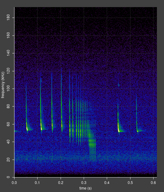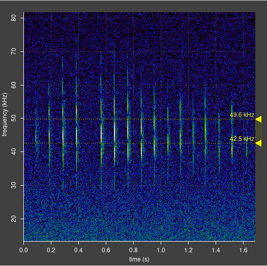 Approaching it a different way, based on the Daubenton bat spectrograms above, the echo delay measured from the spectrogram just before the feeding buzz is about 0.5 ms. At 45 kHz, that’s about 22 cycles, so there are 22 wavelengths of sound in the path difference (n = 22). The predicted band spacing around 45 kHz, by the formula above, is about 2 kHz (45,000 / 22). Measured from the spectrogram, the band spacing is actually 2.5 kHz, which is fairly close, but not exactly what we predict.