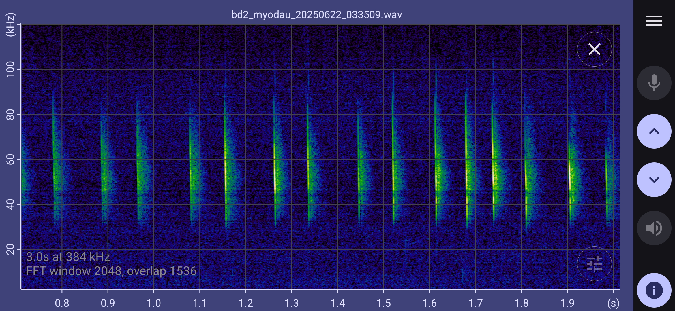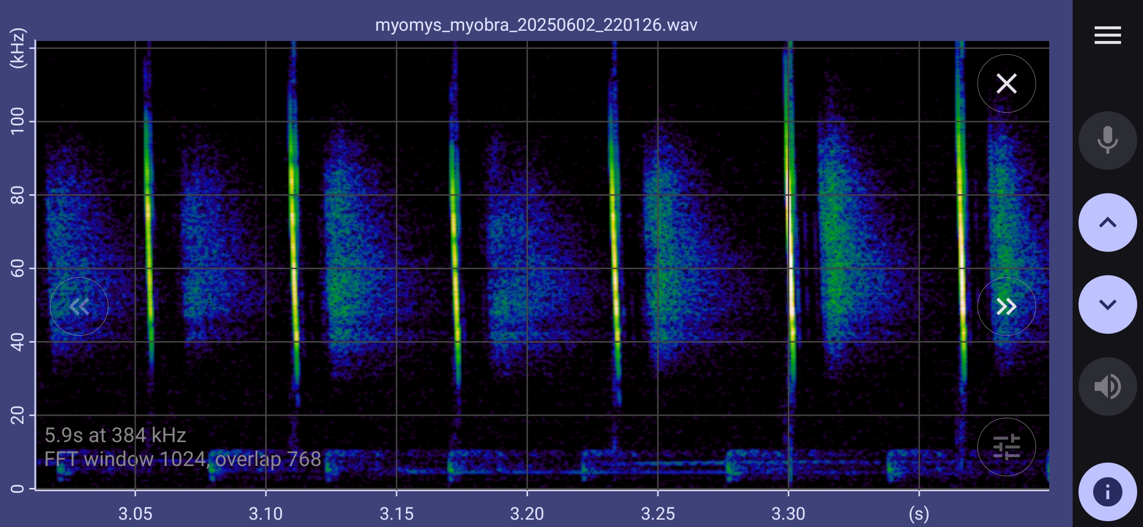 Brandts and whiskered bats are virtually indistinguishable from the sounds they make, though whiskered are more common in woodland. The highest frequency is consistently higher than for daubentons, and the lower frequency consistently higher than for natterer.