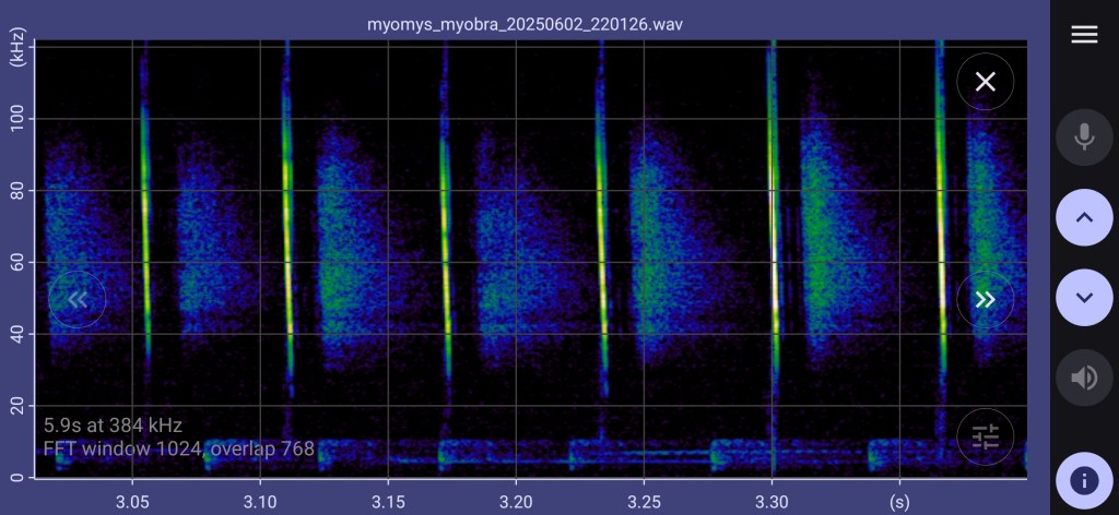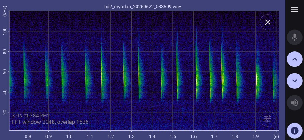 Daubenton bats are easily confused with other myotis family bats (natterer, Brandt’s and whiskered for example). The highest frequency is consistently lower than for natterer and whiskered/brandts; the lower freqency consistently higher than for a natterer.