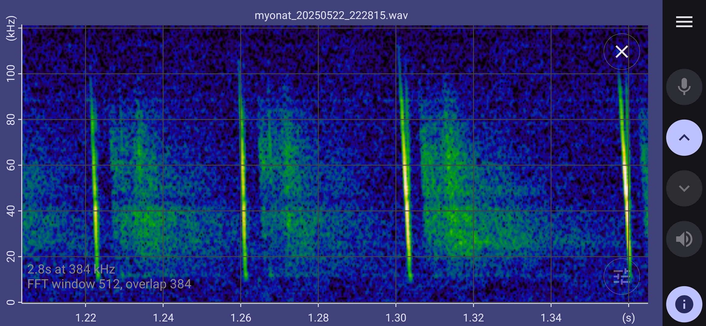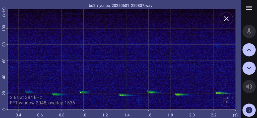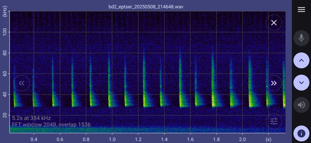 Serotine echolocation chirps are hockey stick shaped liked pipistrelles, but ending at a lower pitch, just above 30 kHz in this case. The interval between chirps is also greater. The frequency range is wider and more consistent than for noctule and leisler bats, whose chirps can be similar when they are flying in clutter.