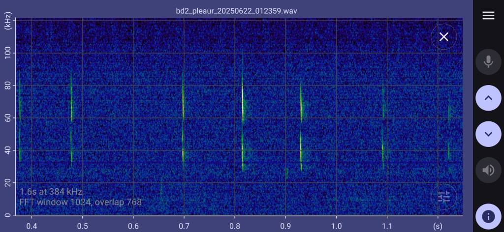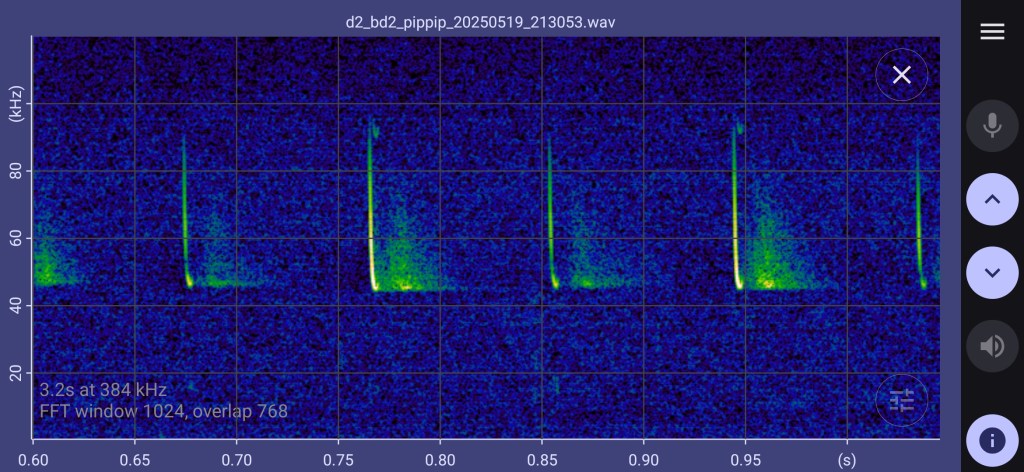 Pipistrelle echolocation chirps have a distinctive hockey stick shape, with greatest intensity at the lowest frequency, in this case around 45 kHz making it a common pipistrelle. For a soprano pipistrelle, it would be a little higher, over 50 kHz.