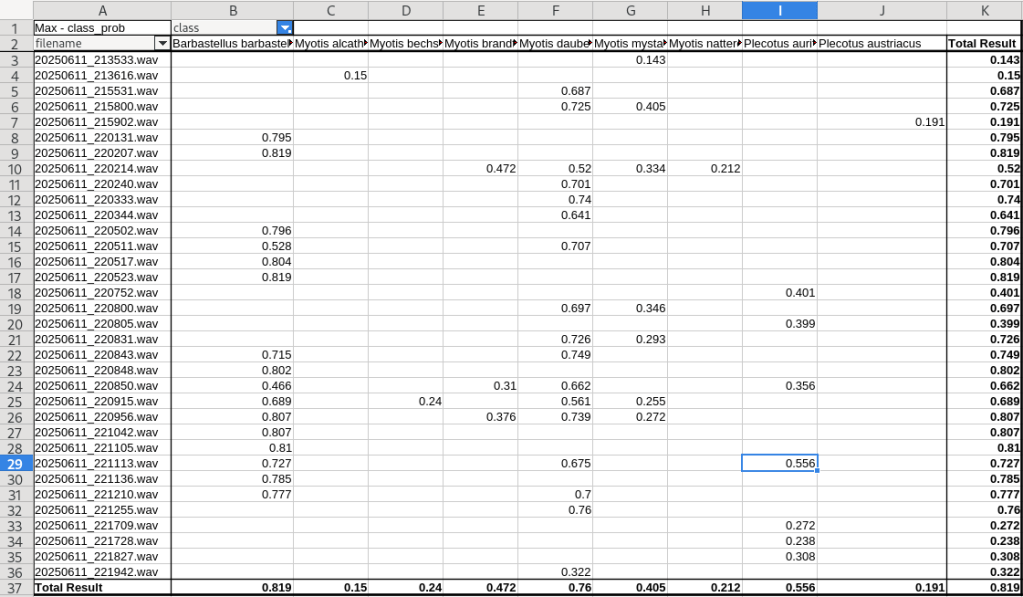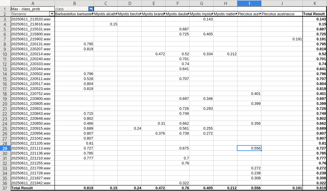A summary of automated analysis results from BatDetect2. Some of these probabilities have to be taken with a generous helping of salt, but they provide a good starting point for manual analysis.