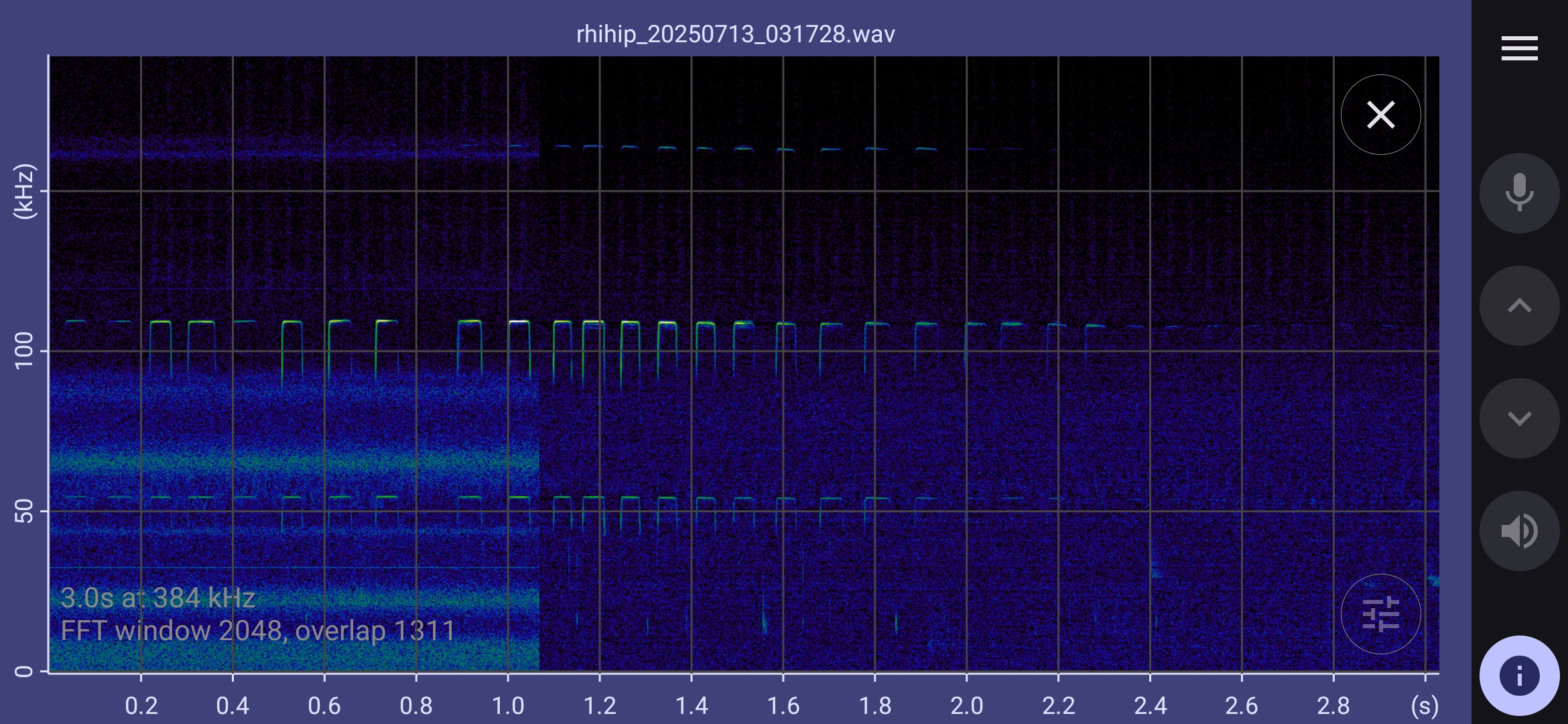 When you are viewing live spectrogram data from microphone, you can record the raw data to file. Files are in the standard .wav format, with GUANO metadata included to include the microphone type, location, etc. Files are written to the device’s internal storage, and can be found under Documents | BatGizmo. They are stored in date folders, and the files themselves are named by date and time (example: 20250809_192548.wav). You can access them using other apps, such as file browsers.