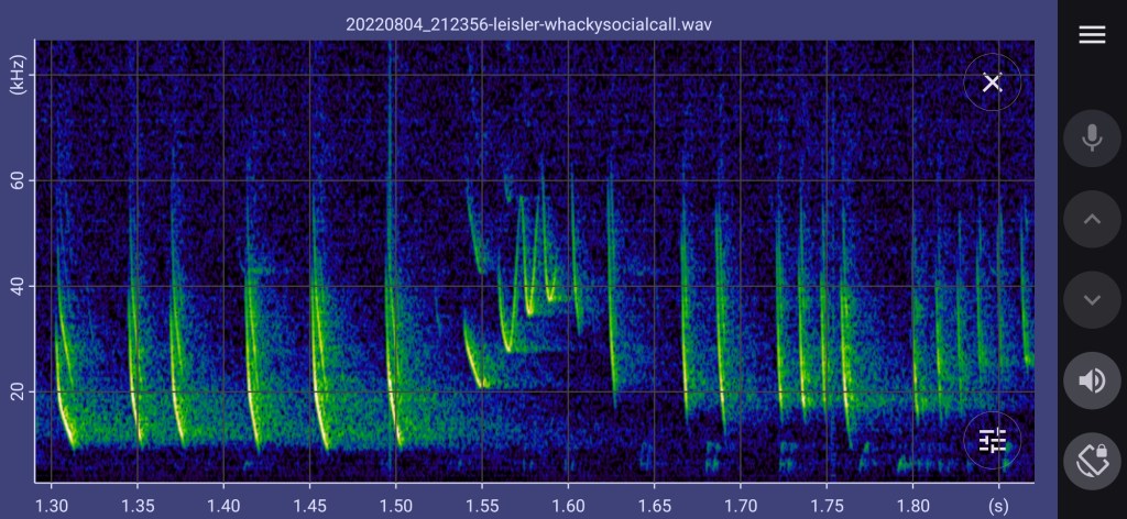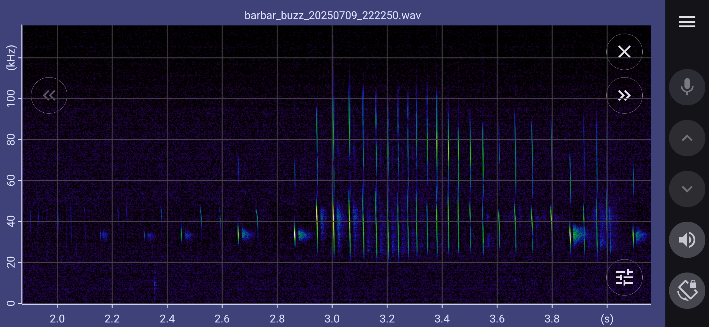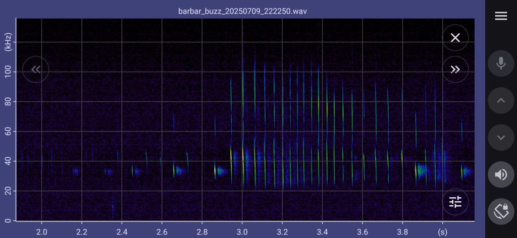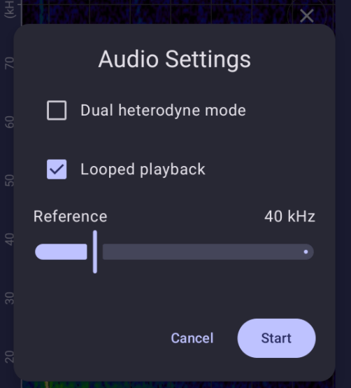 BatgizmoApp allows two channels of heterodyne to be configured. For example, if you are interested in both greater and lesser horseshoe bats, you might tune a channel to 83 kHz and a channel to 110 kHz.