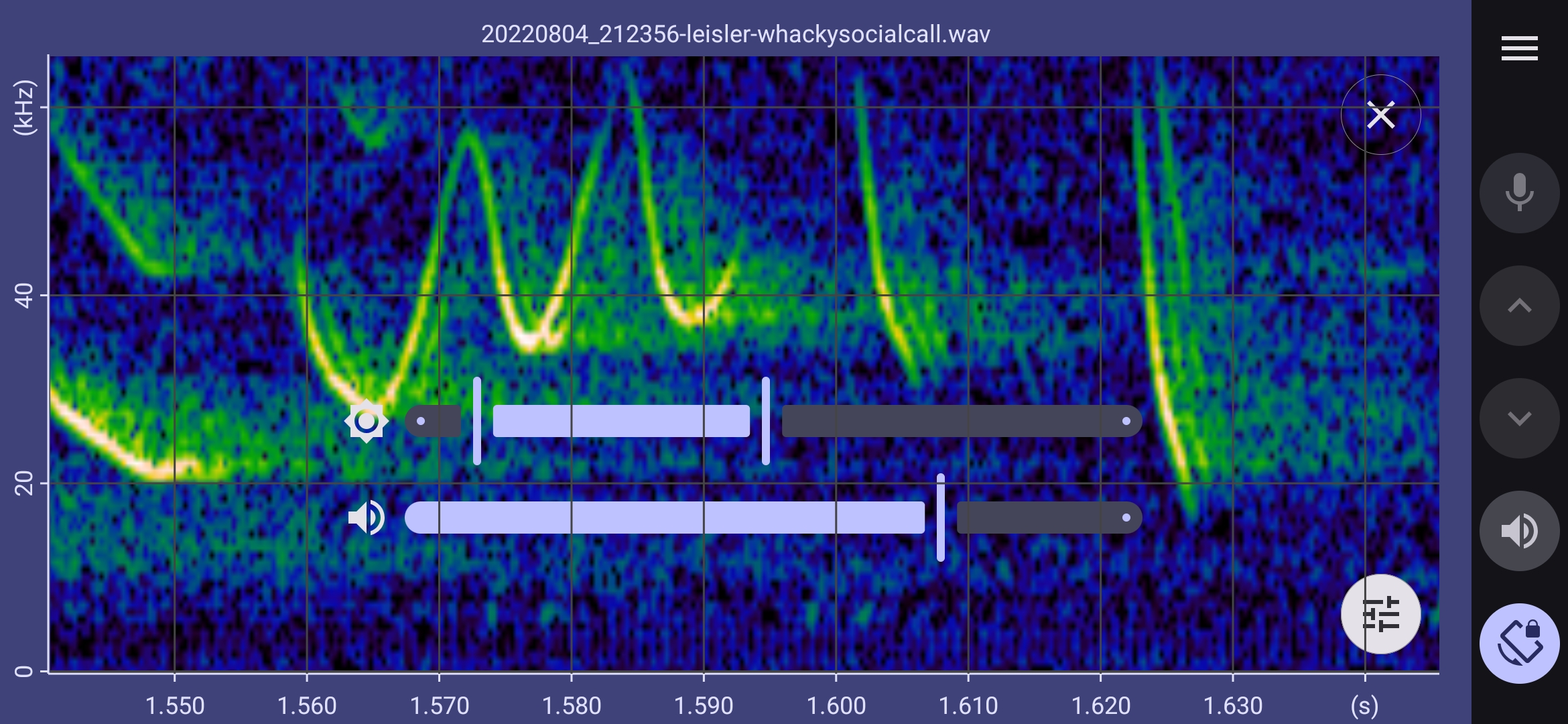 in the bottom right of the display is enabled. Tapping this button overlays the spectrogram with range sliders, including one that can be used to adjust the appearance of the display. Make adjustments by dragging the left or right slider control with your finger, or tap to either side oft the control. Tap the sliders button again to hide the slider.